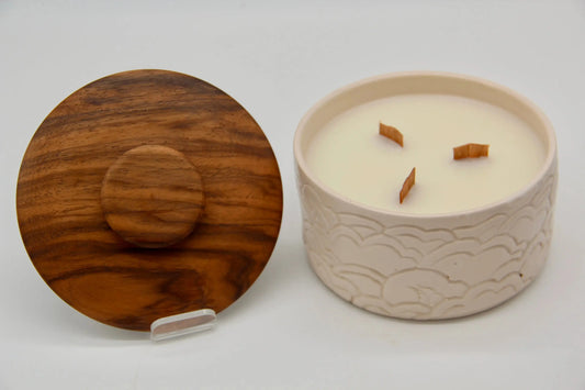 Sur les marchés d’été, j’ai pu rencontrer de nombreux artisans et j’ai eu l’occasion de collaborer avec Antony Terrieux, céramiste situé à Bayonne, dont le style unique est à découvrir sur sa page Instagram : Terrieux_ceramics. Une de ses pièces nous a inspiré le contenant de cette bougie. Antony dessine directement sur le grès des courbes évoquant des nuages, un symbole inspirant qui allie le caractère de la terre à la légèreté des motifs.