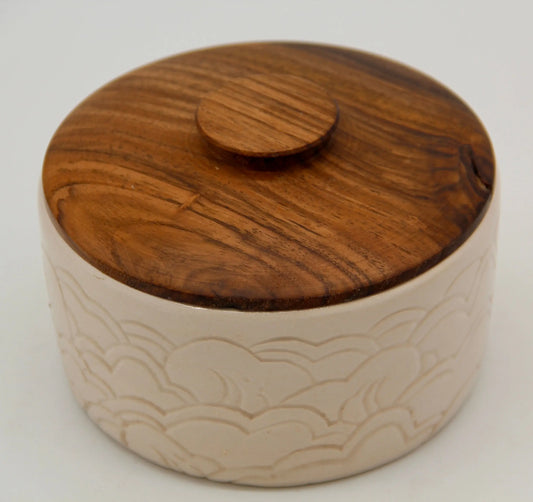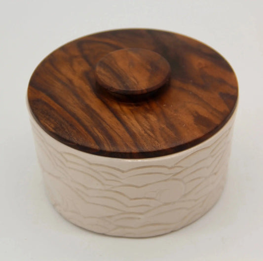Nous avons ajouté un couvercle en noyer, qui se marie parfaitement avec la couleur crème du grès et renforce le caractère de la pièce grâce au veinage prononcé du bois.