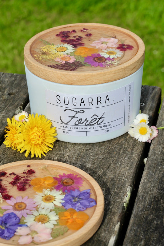 Chaque pièce est sublimée par un couvercle en chêne certifié PEFC 🌿, tourné à la main, avec une incrustation de fleurs séchées figées dans la résine.