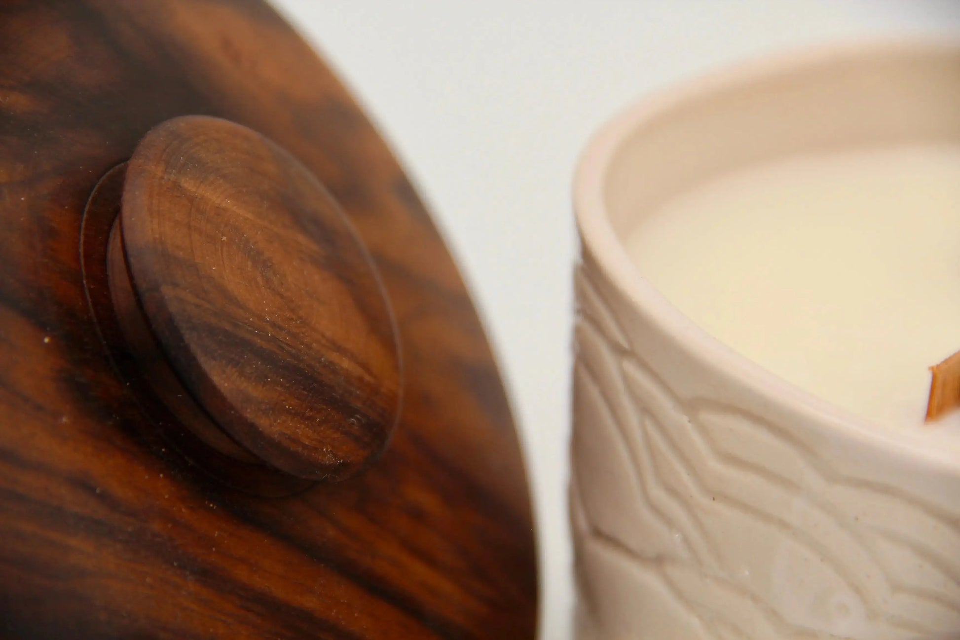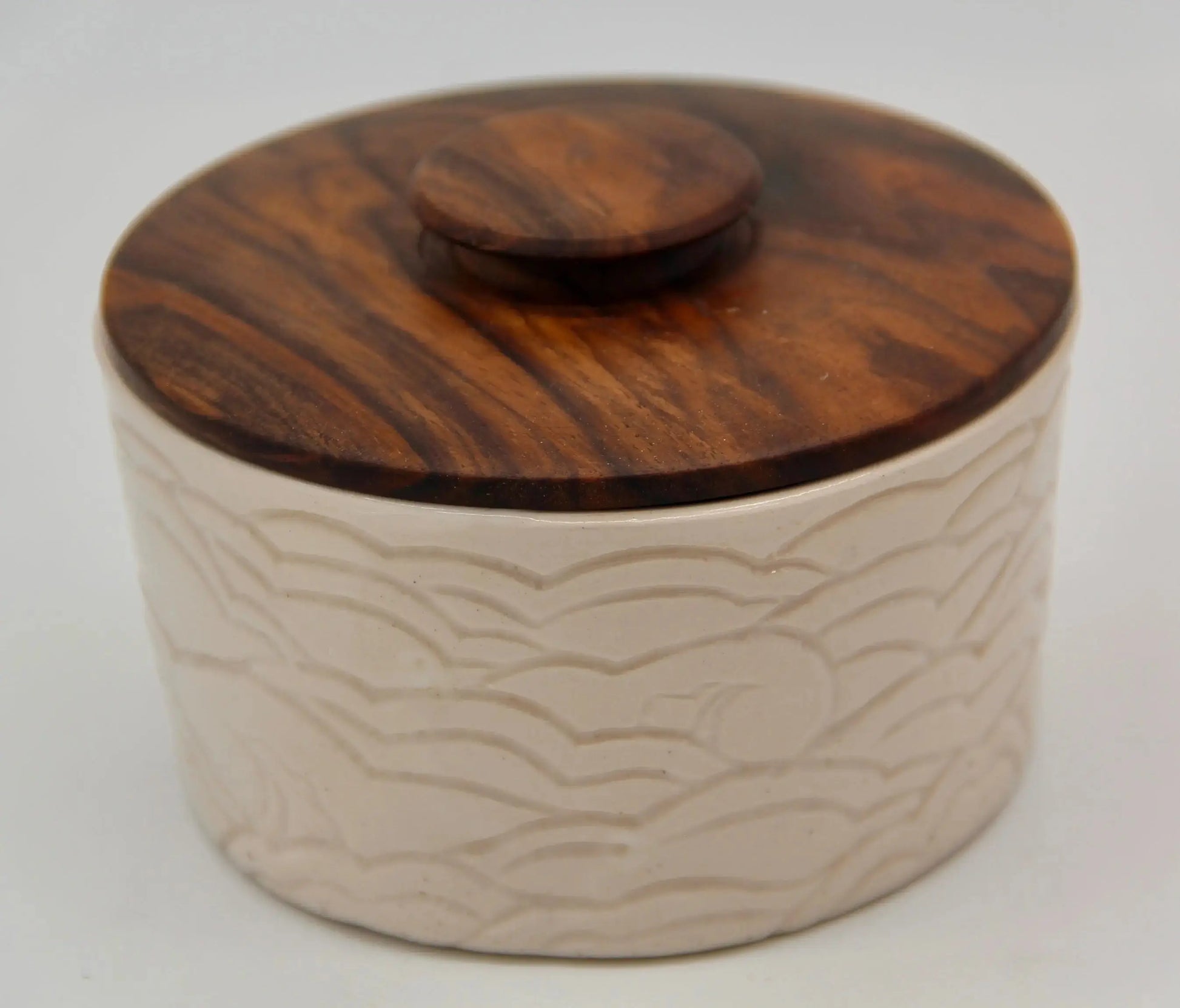 Nous avons ajouté un couvercle en noyer, qui se marie parfaitement avec la couleur crème du grès et renforce le caractère de la pièce grâce au veinage prononcé du bois.