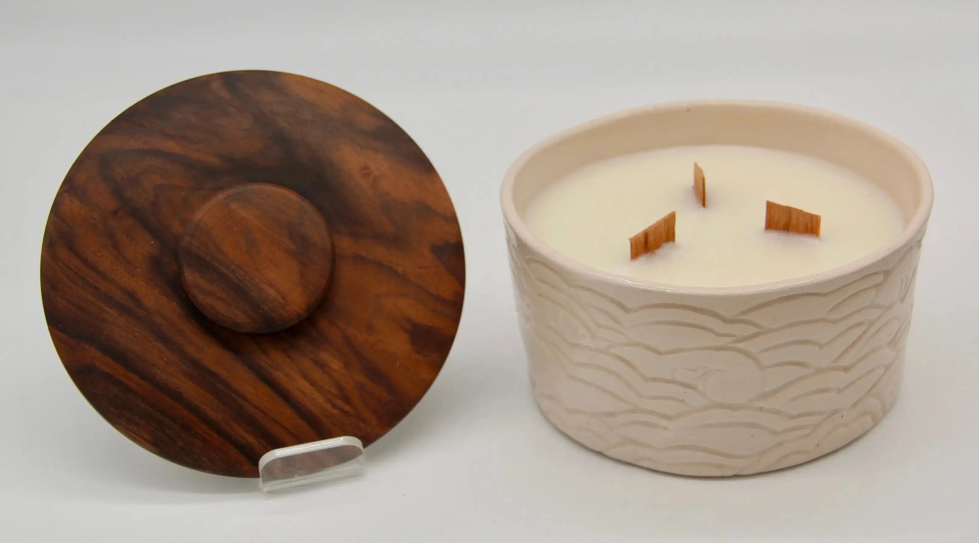 Sur les marchés d’été, j’ai pu rencontrer de nombreux artisans et j’ai eu l’occasion de collaborer avec Antony Terrieux, céramiste situé à Bayonne, dont le style unique est à découvrir sur sa page Instagram : Terrieux_ceramics. Une de ses pièces nous a inspiré le contenant de cette bougie. Antony dessine directement sur le grès des courbes évoquant des nuages, un symbole inspirant qui allie le caractère de la terre à la légèreté des motifs.