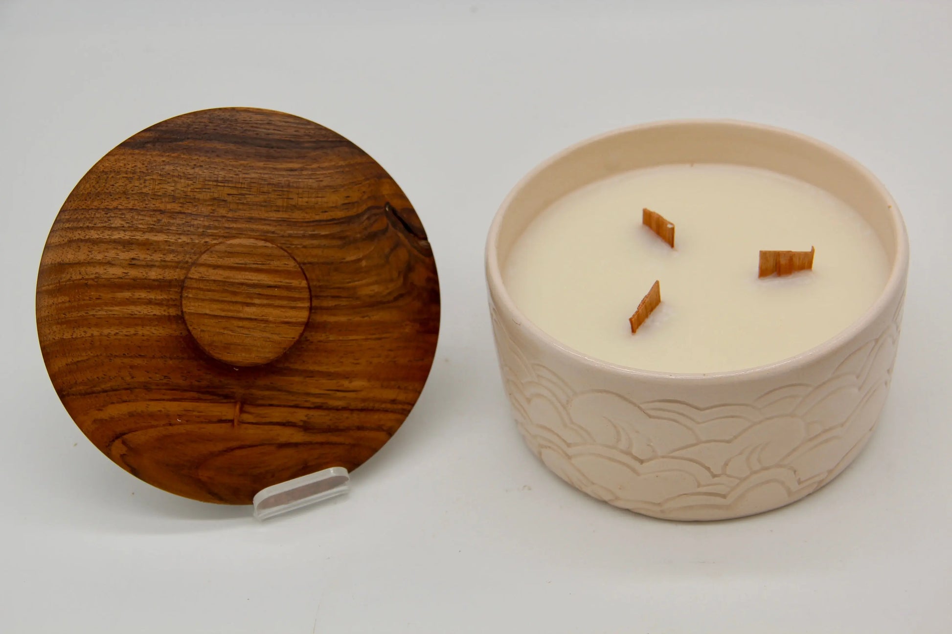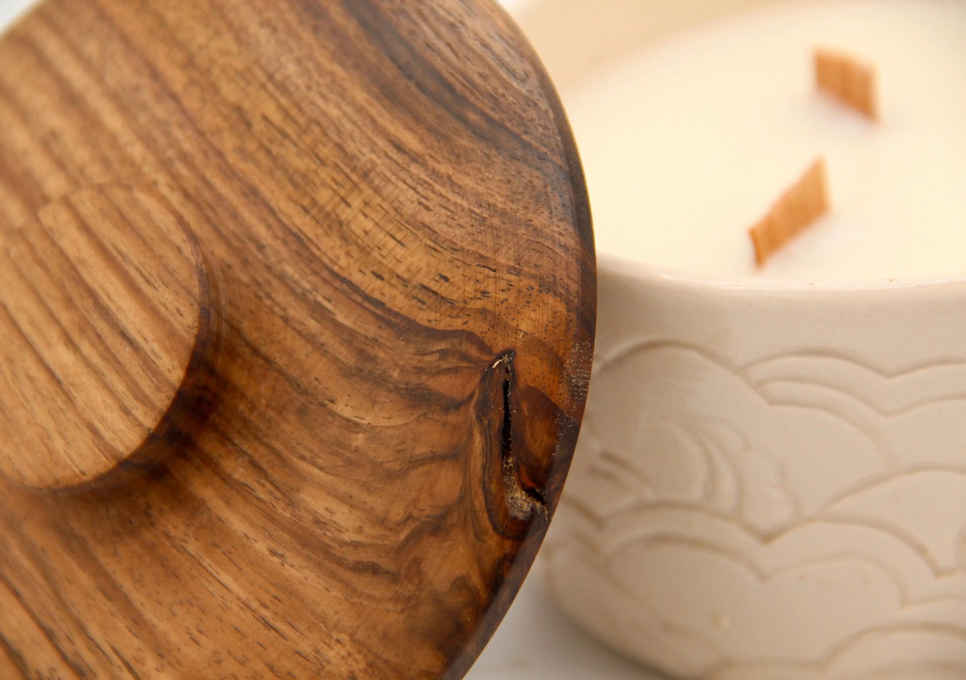 Alliez design et authenticité avec cette bougie unique, façonnée en grès par le céramiste bayonnais Antony Terrieux et sublimée par un couvercle en noyer massif.