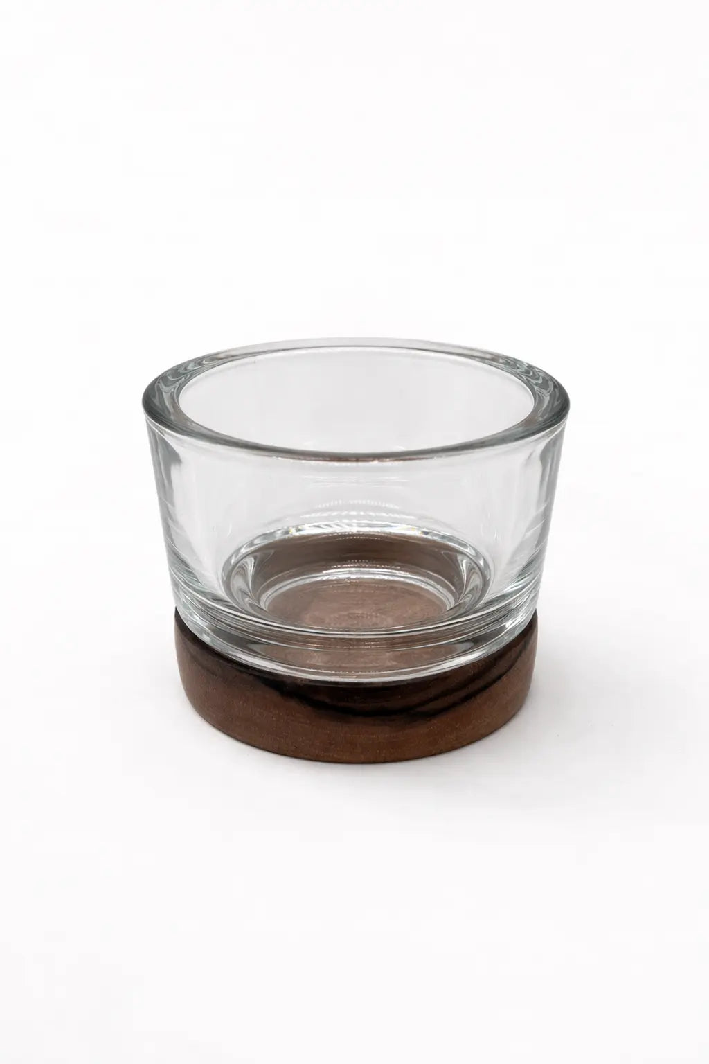 Ce photophore associe un verre transparent épais à un socle rond en noyer massif, offrant une esthétique élégante et raffinée. La teinte profonde et chaleureuse du noyer contraste harmonieusement avec la clarté du verre et sublime la lumière de la flamme.