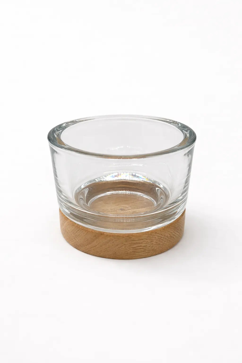 Ce photophore associe un verre transparent épais à un socle rond en chêne massif, pour un rendu à la fois élégant et naturel. Le contraste entre la clarté du verre et la chaleur du bois met délicatement en valeur la flamme.